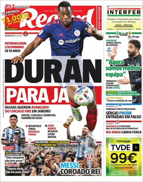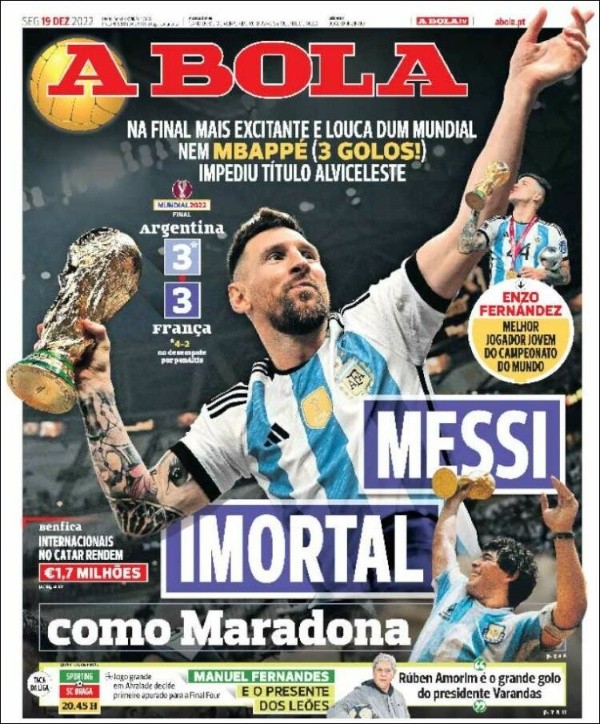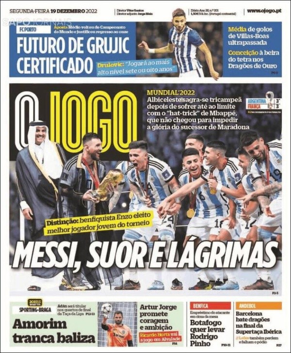 Por otro lado O Jogo se hizo eco de la elección de Enzo Fernández como Mejor Jugador Joven del Mundial y destacaron que sucedió a Kylian Mbappé, además publicaron una nota sobre los elogios que cruzaron en las redes sociales Enzo y Otamendi. Por su parte el portal Record también destacó el premio recibido por Enzo y aseguraron que hizo lo mismo que Pelé, Beckenbauer y Mbappé, al lucirse en un Mundial siendo tan joven.