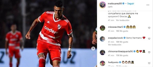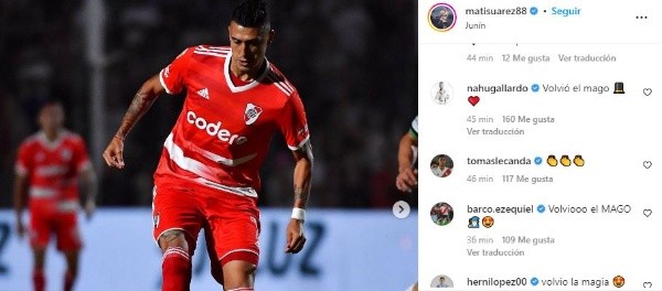 Rápidamente, recibió comentarios de algunos futbolistas del actual plantel de River y de otros que ya no están pero con quienes guarda una gran amistad: Exequiel Palacios, LucasMartínez Quarta, Nahuel Gallardo y Felipe Peña Biafore, entre otros.