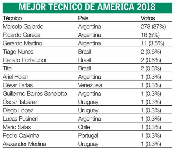 MarceloGallardo se quedó con el premio que otorga el diario uruguayo El País superando por una diferencia gigante a sus compatriotas Ricardo Gareca y Gerardo Martíno. El 87% de los votos fueron para el Muñeco, mientras que para el Tigre fueron el 5% y para el Tata el 3,5%.