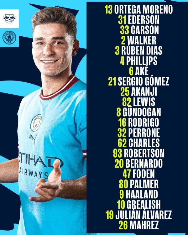 Este miércoles el City comenzará a transitar el camino de los octavos de final de la Champions League, su principal objetivo, frente al Leipzig. El partido comenzará a las 17 horas (Argentina) y se disputará en el estadio Red Bull del conjunto alemán. Para este encuentro el DT de los Citizens dejó fuera de la nómina de convocados a varios pesos pesados, como son los casos de Kevin de Bruyne, John Stones y Aymeric Laporte. Por su parte, dentro de los 22 citados aparece Julián Álvarez.