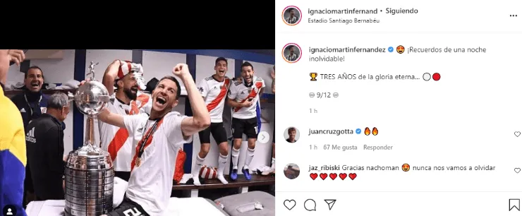 Además de los responsables de los tres tantos en la cancha del Real Madrid, el que dio una gran asistencia también dijo presente. Nacho Fernández publicó desde Brasil: “Recuerdos de una noche inolvidable! TRES AÑOS de la gloria eterna”.