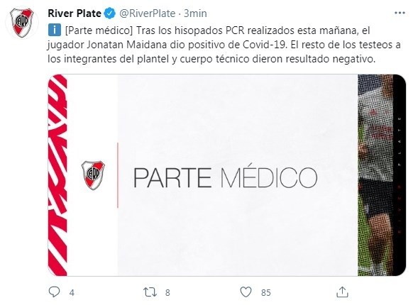 Esta mañana, todo el plantel de River –incluido el cuerpo técnico- se realizó los testeos obligatorios previos a la competencia –ya que el equipo de Marcelo Gallardo recibirá a Junior de Barranquilla por la segunda fecha de la Copa Libertadores el próximo miércoles- y los resultados llegaron por la tarde y desafortunadamente Jonatan Maidana dio positivo de coronavirus y deberá permanecer aislado hasta su total recuperación, la cual está estimada en diez días. Aunque si cualquier profesional está parado por diez días, deberá ponerse a punto desde lo físico, por lo que el regreso de Joni podría darse recién dentro de unas dos semanas aproximadamente.