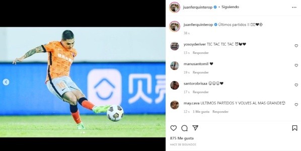 Tras la derrota de su equipo contra el Changchun Yatai el colombiano publicó en su cuenta de Instagram do imágenes suyas del partido y escribió “Últimos partidos”. Lo que deja totalmente en claro que Quintero atraviesa sus últimos días en China y que ya está todo acordado para que regrese a River. La dirigencia del Más Grande negociará con Shenzhen un préstamo por un año, hay que destacar que para que esta operación se lleve a cabo fue determinante las ganas de Quintero de volver a Núñez y también la deuda del Shenzhen con él.