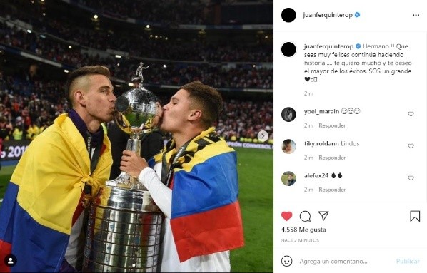 La unión en el grupo es una pata fundamental para Marcelo Gallardo, que a lo largo de sus 7 años supo armar grupos humanos que perduraron en el tiempo y trascendieron la camiseta de River, es habitual que ex compañeros del Más Grande se comenten publicaciones en las redes sociales pese a vestir otras camisetas. En esta oportunidad Juanfer Quintero que se encuentra en el Shenzhen de China despidió a Rafa y le deseó lo mejor de cara a un futuro prometedor en el fútbol alemán: “Hermano!! Que seas muy feliz y continúes haciendo historia… te quiero mucho y te deseo el mayor de los éxitos. Sos un grande”, el mensaje estuvo acompañado de un corazón y una bandera de Colombia.