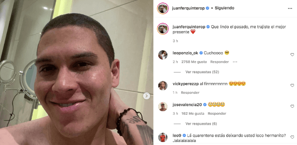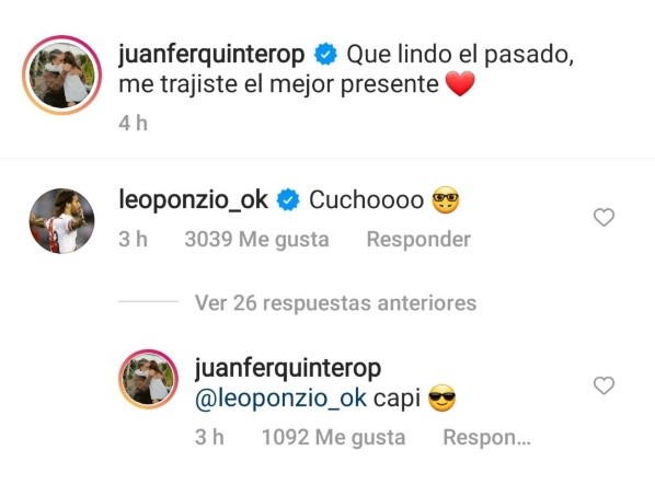 Mientras define qué será de su futuro después de fin de año, Leo Ponzio apareció en la publicación del colombiano y le dejo un gracioso comentario: “Cuchoooo”, escribió el León, bromeando con los anteojos para leer que usa Juanfer. Obvio que el Nalgón le devolvió la pared y puso “Capi”. Una vez más, River es familia y la buena onda entre jugadores y ex jugadores siempre está presente.
