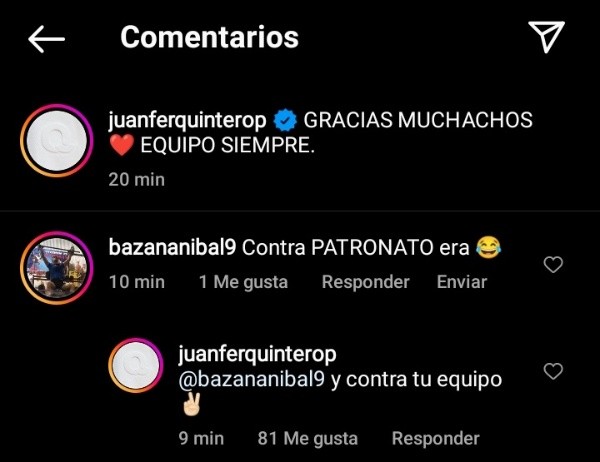 La publicación también tuvo respuestas de varios jugadores del actual plantel como Mammana, De la Cruz, Barco y Palavecino y otros ex futbolistas del club como Enzo Fernández y Carlos Sánchez. Hasta Roger Martínez, compañero de Juanfer en la selección colombiana, y el rapero Wos, muy identificado con River, se expresaron sobre el golazo del 10 en la publicación.