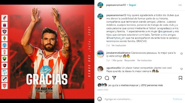 Tras la gesta, Pepe, que jugó un solo partido en River (2007 contra Vélez, bajo el mando de Daniel Passarella)se sintió hecho y decidió colgar los botines con 34 años de edad.”Hoy quiero agradecerle a todos los clubes que me dieron la posibilidad de formar parte de su historia, compañeros que terminaron siendo amigos, utileros, cuerpos médicos, cuerpos técnicos, personal de trabajo de cada club y a cada persona que conocí mediante el fútbol. Le agradezco a mis amigos y familia.Y especialmente a mi mujer Eugenia y mis hijos que siempre estuvieron a mi lado. Gracias”, expresó San Román en su Instagram.