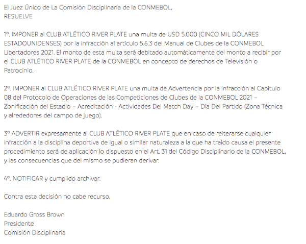 Al igual que en las anteriores, el monto del apercibimiento será debitado automáticamente del monto a recibir por River en concepto de derechos de televisión o patrocinio. En las últimas horas, la Conmebol también dio a conocer sanciones para la delegación de Atlético Mineiro que protagonizó los disturbios ante Boca el pasado 20 de julio.