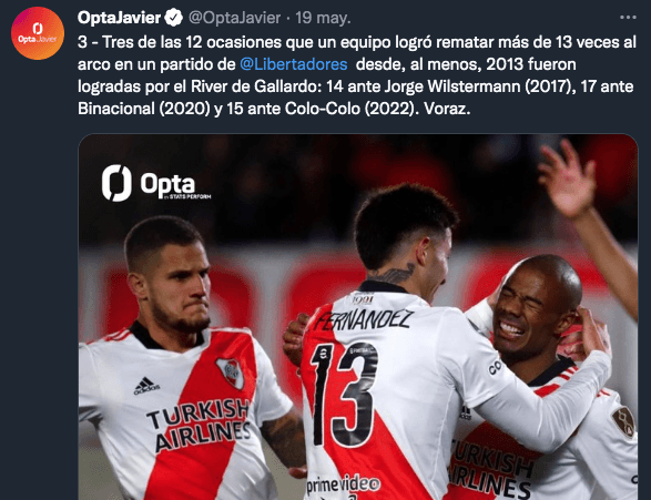 Desde el año 2013, solo hubo 12 partidos de Copa Libertadores en los que un equipo logró rematar por lo menos 13 veces al arco. No solo un disparo, sino que ese disparo vaya entre los tres palos. De esas 12 ocasiones, tres lo tienen como protagonista a River, siendo el que más veces logró alcanzar estos números en el último tiempo: pateó 14 veces ante Jorge Wilstermann en el 2017 en el Monumental, 17 ante Binacional en el Monumental en 2020y 15 ante Colo Colo la otra noche.