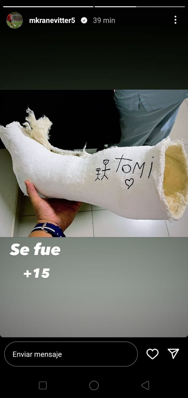 En las últimas horas Matías Kranevitter compartió en sus redes sociales una imagen que causó alegría y esperanzas en el jugador, pero también en los hinchas de River. El tucumano posteó una foto con la bota de yeso cortada, acompañada por una frase: “Se fue”. Ahora comienza una nueva etapa en su recuperación: los trabajos de kinesiología para fortalecer el tobillo y que el hueso logre soldar dentro de los tiempos estipulados.