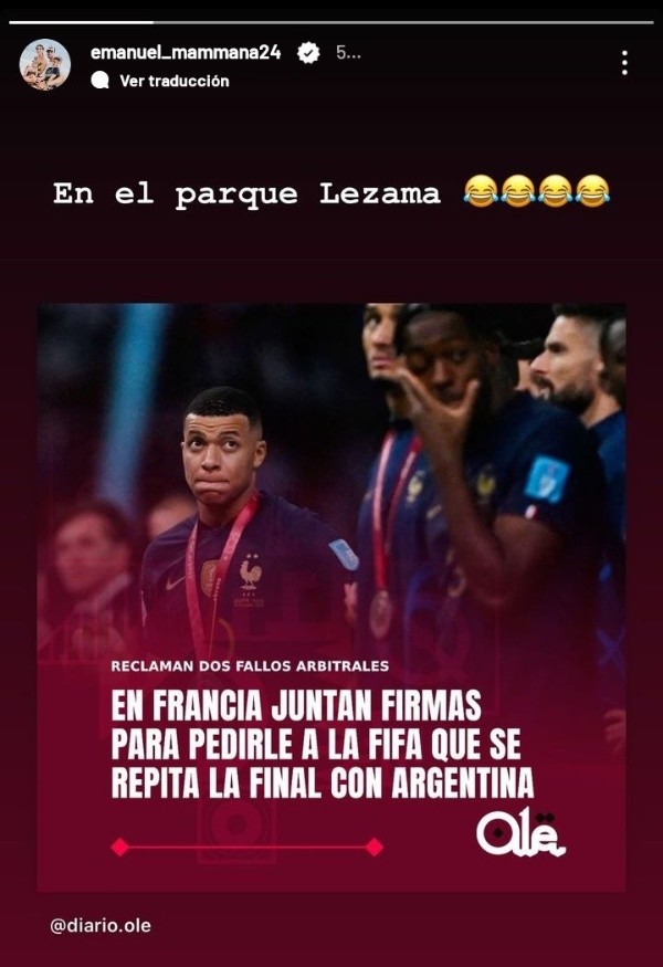 En su cuenta de Instagram, Ema reposteó una publicación que hablaba del pedido de firmas para que la final con los franceses se juegue de nuevo, puso emojis de risa y además una frase que también va con cargada para Boca: “En el Parque Lezama”, escribió el defensor, haciendo referencia al historico cántico burlándose del Xeneize. Entendiste todo Ema.
