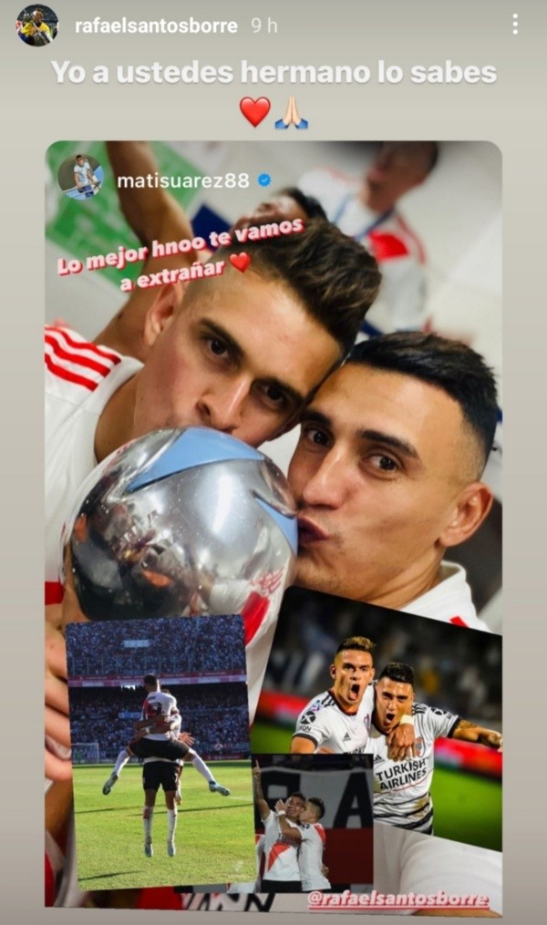 Matías Suárez y Rafael Borré conformaron una dupla consolidada de ataque en los últimos dos años con la confianza absoluta de Marcelo Gallardo, y con un complemento fantástico dentro de la cancha yuna gran química fuera del rectángulo de juego. El colombiano confirmó en las últimas horas su arribo a la Bundesliga, ya que jugará en el Eintracht Frankfurt durante las próximas cuatro temporadas, y suamigo cordobés se tomó su tiempo para despedirlo de gran manera.