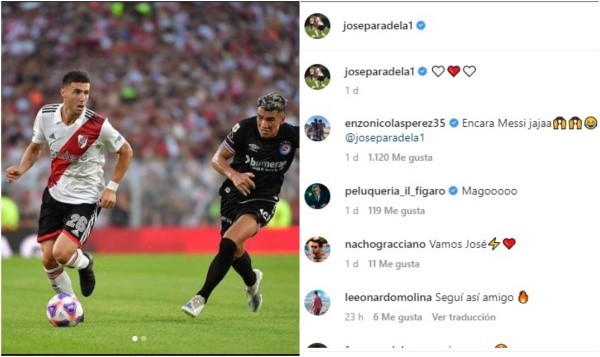 Tras la victoria frente al Bicho, Paradela posteó una foto en su cuenta de Instagram del último encuentro en el Monumental trasladando la pelota frente a la marca de Rodrigo Cabral. El volante el Más Grande agregó los corazones blancos y rojos para acompañar la imagen. Enzo Pérez no perdió la ocasión para meter su “bocadillo” y respondió: “Encara Messi jajaja”. Su comentario enloqueció a los hinchas de River y generó más de 1100 “me gusta”. Si lo dice el capitán…