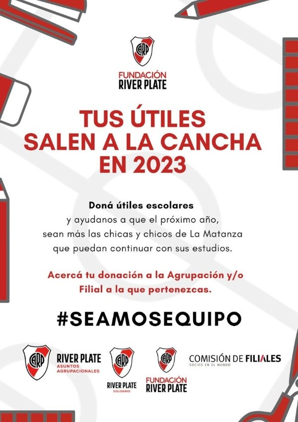 La Subco del Hincha de River se sumó la colecta de útiles que llevan a cabo la Fundación River, la Comisión de Asuntos Agrupacionales, River Solidario y la Comisión de Filiales para ayudar a los más chicos a quepuedan seguir estudiando. Por esta razón, quienes asistan al festejo por el 9 de diciembre podrán acercar sus donaciones el mismo día del evento.