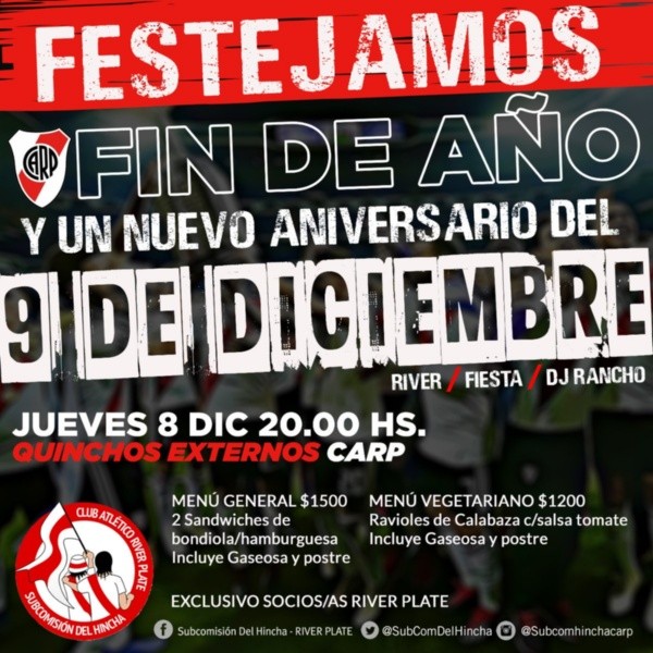 Como la Selección Argentina disputará un partido trascendental por los cuartos de final de la Copa del Mundo, los festejos deberán adelantarse un día, apenas unas horas, para recibir el 9/12 a las doce de la noche con una fiesta bien riverplatense. Es por esto que la Subcomisión del Hincha decidió organizar este jueves 8 de diciembre un festejo en los quinchos externos del club, que también servirá como excusa para despedir el año.