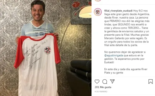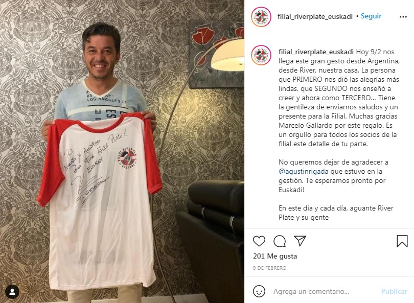 River cuenta con filiales por todo el mundo, en todos los continentes hay. España es un país en el cual residen muchos argentinos y el País Vasco no es la excepción, allí se formó la filiar River Plate Euskadi, que cuenta con varios socios que tiene su propio carnet e inclusive en enero de 2021 le hicieron llegar una de las remeras nada más y nada menos que a Marcelo Gallardo, quien amablemente la firmó y posó con ella en una foto. La filial es muy activa en las redes sociales y allí publicaron algunos saludos que recibieron de grandes futbolistas que vistieron el Manto Sagrado como es el caso de Ariel Ortega y Javier Saviola entre otros.