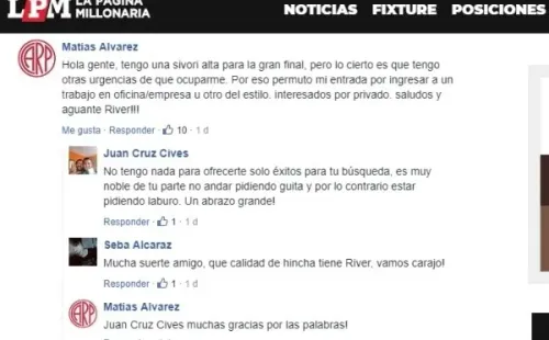 Lo dudó por su fanatismo, pero luego de meditarlo tomó la decisión. Matías comentó la nota de entradas agotadas de La Página Millonaria proponiendo permutar su ticketa cambio de un trabajo en una oficina o empresa. “Se me hace difícil meterme a trabajar en el ámbito de la carrera, y hace un par de meses me quedé sin laburo“, nos cuenta.