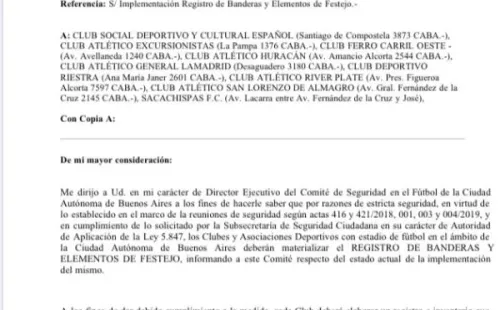 Pero a partir del momento en el que el fútbol permita nuevamente el ingreso de público a las canchas las exigencias al respecto van a endurecerse aún más. Es que desde el Comité de Seguridad de la Ciudad de Buenos Aires exigieron a todos los clubes que se encuentren en el territorio porteño a que deberán llevar un “Registro de Banderas”, donde exista un padrón que enumere a cada una que ingresará a los estadios. “Dichos elementos deberán guardarse en un local del estadiodestinado a tal efecto”, sostiene una parte del comunicado oficial.