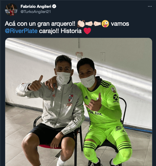 Ni culminó el partido ante Santa Fe, todos fueron a abrazar a Enzo Pérez y lo fueron felicitando uno por uno, en la cancha, en la manga y hasta llegar al vestuario. Algunos, como Fabrizio Angileri, bromearon con la nueva faceta de Enzo: “Acá con un gran arquero. Vamos River, hicimos historia“, escribió el Turco, oriundo de Mendoza al igual que Enzo, en su cuenta de Twitter.