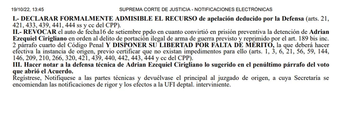 Poco más de dos meses después, finalmente llegó la resolución de la Sala II de la Cámara de Apelación y Garantías en lo Penal de San Martín. El juez, luego de analizar los hechos y las evidencias que formaban parate de la causa, dictaminó la falta de mérito de Ezequiel Cirigliano. De esta manera, su liberación es inminente. De hecho, su familia ya se encuentra rumbo a la Comisaría 1° de Caseros, el lugar donde estuvo detenido hasta la fecha, para ir en busca del detenido que hoy quedará en libertad.