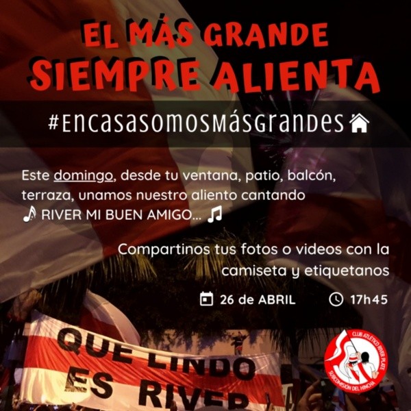 Además de entonar las típicas estrofas que se usan cuando el equipo sale a jugar en Núñez, la intención es que la presencia de River se multiplique fuertemente mediante Twitter, Facebook e Instagram con un hashtag: #ENCASASOMOSGRANDES.