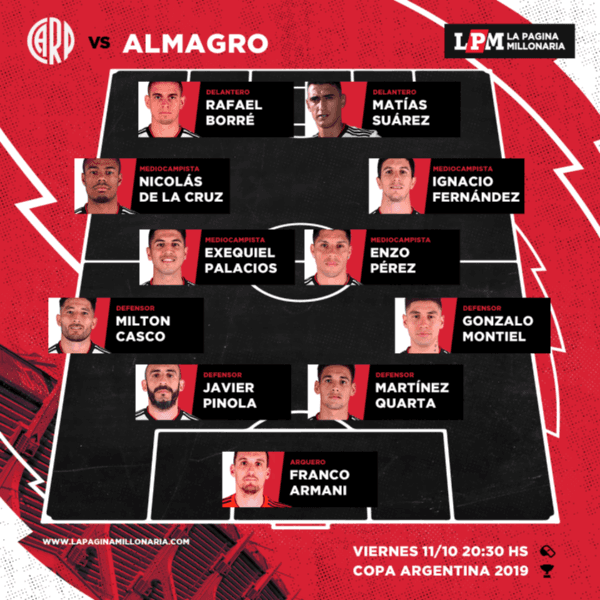 + Así formaría River vs. Almagro: Franco Armani; Gonzalo Montiel, Lucas Martínez Quarta, Javier Pinola, Milton Casco; Ignacio Fernández, Enzo Pérez, Exequiel Palacios, Nicolás De La Cruz; Matías Suárez y Rafael Borré.