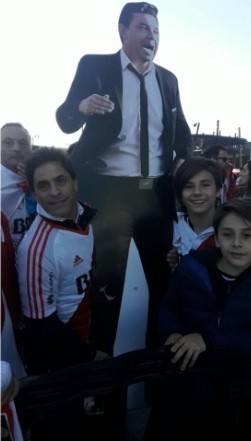 -En la semifinal de vuelta contra Gremio del año pasado ocurre algo igual a lo del 2015. Justo esa noche en Brasil surge una nueva canción espontánea de la gente, la que dice “la caravana de porto Alegre” y “de la mano del Muñeco y de Biscay”. Y ahí dije que eso era una señal, y decidí hacer la gigantografía de Biscay. Si no lo hacía me iba a sentir culpable si River no ganaba la copa. Así que el 24 de noviembre, cuando luegose terminó suspendiendola final de la copa, llevé las dos gigantografías a la cancha y la gente se amontonaba para pedirme fotos con ellas, je. Y ahí tengo una anécdotamuy linda para contar.