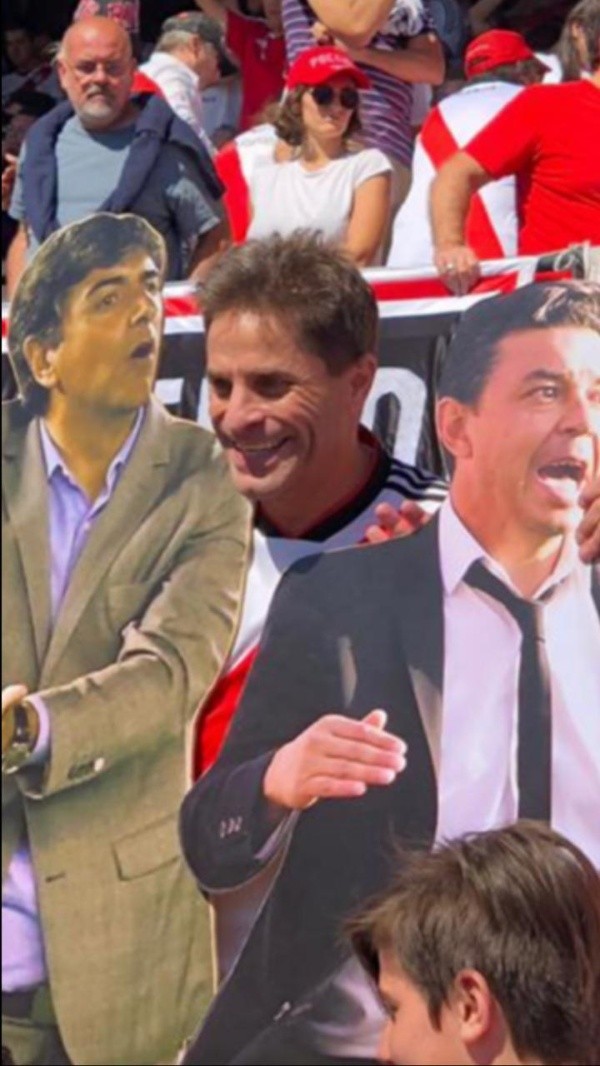 Fernando en el Monumental con las gigantografías de Gallardo y Biscay