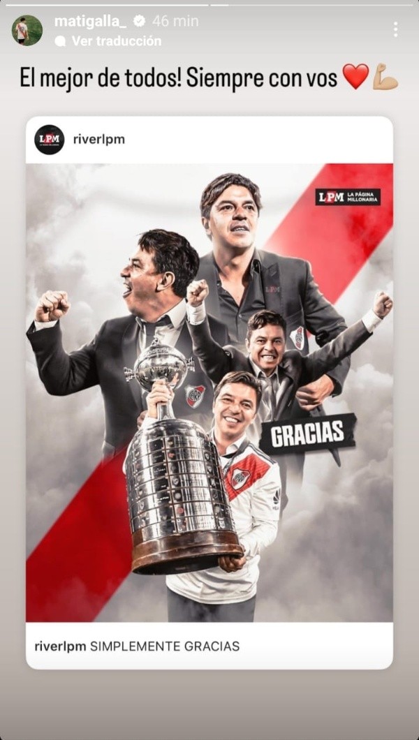 Unos minutos más tarde, Matías Gallardo compartió una publicación de La Página Millonaria y agregó su sello personal: “El mejor de todos! Siempre con vos”, comentó el Chino, que se enteró de la noticia luego del entrenamiento con la Reserva en River Camp. Respuestas y reacciones del entorno más cercano del Muñeco, que mantuvo la decisión en total hermetismo hasta el final.