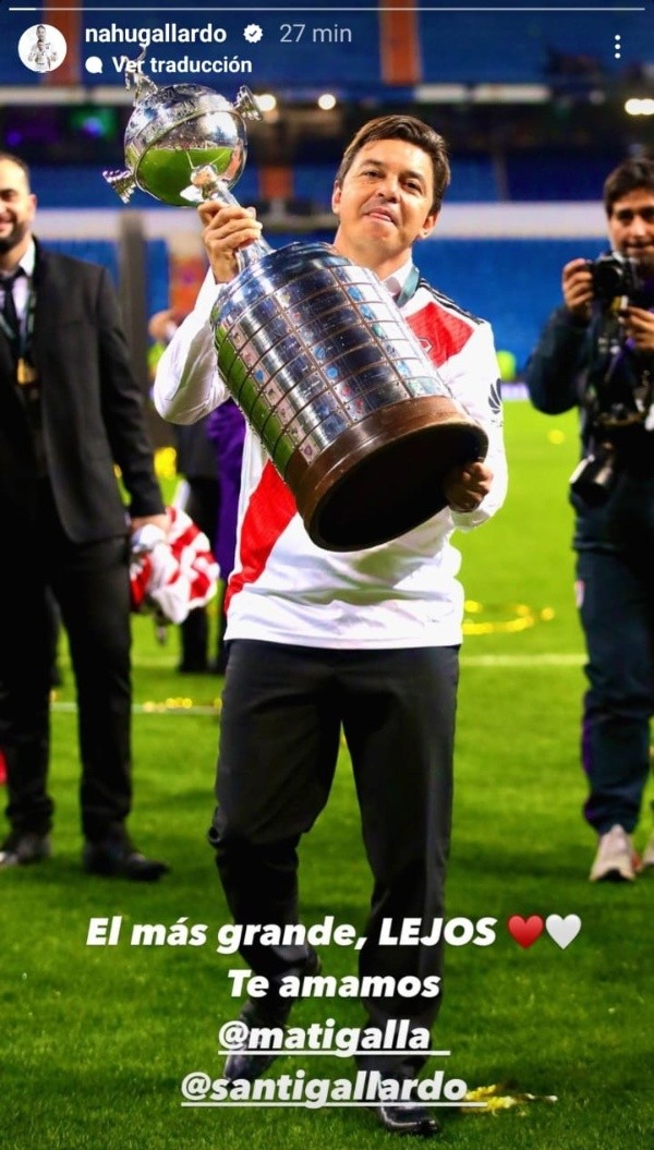 En medio del cimbronazo que generó el anuncio oficial, los primeros en reaccionar a la salida del DT fueron sus hijos. Desde Colombia, Nahuel Gallardo compartió una foto en sus historias de Instagram con la imagen del Muñeco levantando la Copa Libertadores del 2018 en Madrid y la leyenda “El Más Grande, LEJOS. Te amamos” y la etiqueta de sus dos hermanos menores, Matías y Santino.