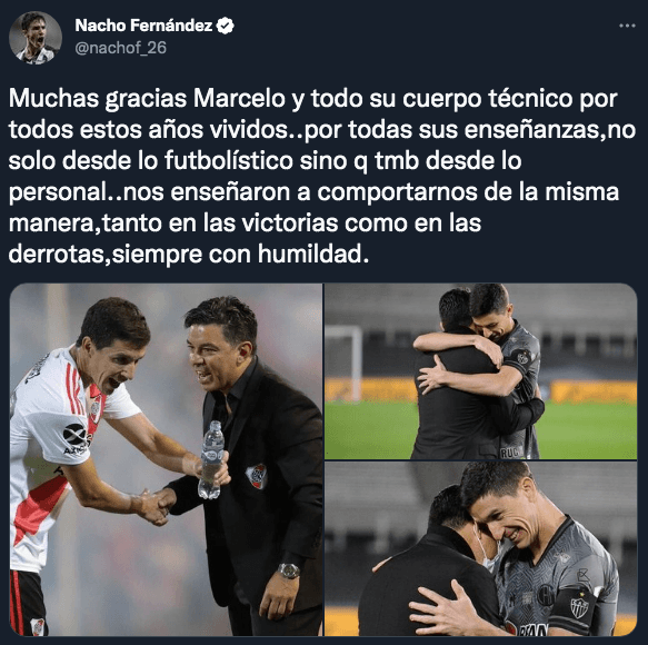 A la distancia, el oriundo de Dudignac se hizo eco de lo que ocurrió este domingo por la tarde, en la última función de Gallardo y Pinola en el Más Grande, y primero le dedicó unas palabras emocionantes al Míster, con quien mantiene una relación casi fraternal: “Muchas gracias Marcelo y todo su cuerpo técnico por todos estos años vividos..por todas sus enseñanzas,no solo desde lo futbolístico sino q tmb desde lo personal..nos enseñaron a comportarnos de la misma manera,tanto en las victorias como en las derrotas,siempre con humildad“.