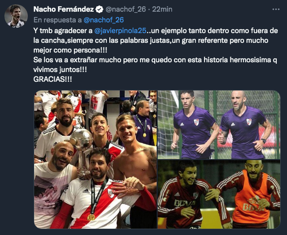 Luego, un párrafo sensible para Pinola: “Y también agradecer a Javier Pinola. Un ejemplo tanto dentro como fuera de la cancha,siempre con las palabras justas,un gran referente pero mucho mejor como persona!!! Se los va a extrañar mucho pero me quedo con esta historia hermosisima q vivimos juntos!!! GRACIAS!!!”. Nacho sigue ganándose los corazones de los riverplatenses con estos gestos y estas acciones que hablan de la persona que es y de lo que siente por el club.