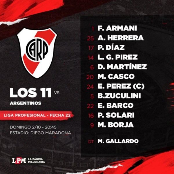 ¿Los once? Franco Armani; Andrés Herrera, Paulo Díaz, González Pírez, David Martínez, Milton Casco; Enzo Pérez, Bruno Zuculini; Pablo Solari, Miguel Borja y Esequiel Barco. Un equipo totalmente inédito en lo que va del año.