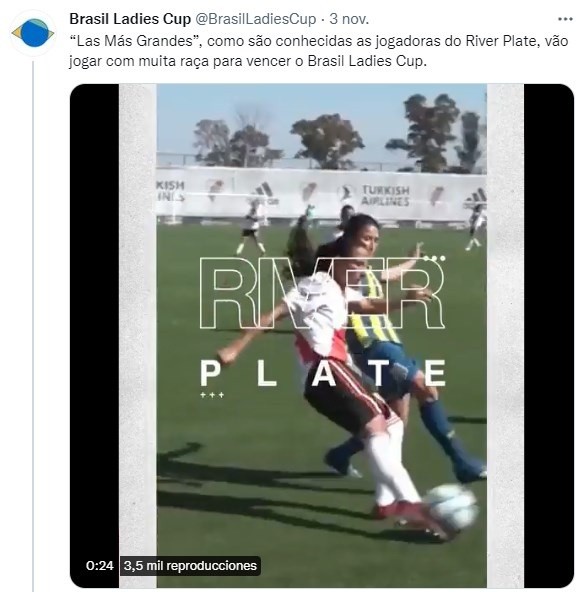 Teniendo en cuenta que River es uno de los clubes más importantes del continente, las Millonarias fueron invitadas a disputar la Brasil Ladies Cup, la cual se disputará entre el 12 y 19 de diciembre. Los equipos participantes son: Ferroviaria, Flamengo, Palmeiras, San Pablo, Santos, América de Cali y Santiago Morning de Chile. La fase inicial se jugará en el Estadio Municipal Santana de Parnaíba mientras que la final en el modern estadio de Palmeiras, el Allianz Parque. A lo largo de toda la semana se desarrollarán distintas actividades como por ejemplo clínicas y charlas para que el fútbol femenino siga creciendo. Será una extraordinaria oportunidad para que las chicas de River se midan ante rivales de jerarquía.