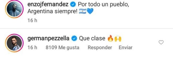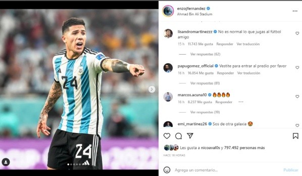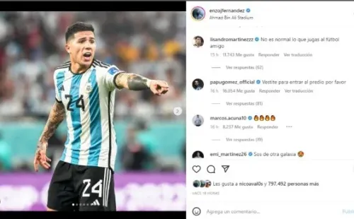 Luego del partido, el ex volante del Más Grande posteó una foto en su cuenta de Instagram y sus viejos compañeros en River y los actuales en la Selección Argentina no lo dejaron pasaron. “Qué clase”, le comentó Germán Pezzella. “Vestite para entrar al predio por favor”, bromeó el Papu Gómez. “No es normal lo que jugás al fútbol amigo”, afirmó Lisandro Martínez. “Sos de otra galaxia”, señaló Dibu Martínez. Mientras que Santi Simón la respondió con un “lo que jugás” y Beto Bologna chicaneó fiel a su estilo con un “sobrado”. También participaron del divertido intercambio Carlos Auzqui, el Tucu Pereyra y Tomás Lecanda. Todos rendidos a los pies del crack de la Scaloneta.