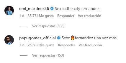 Tras la imponente actuación frente a Croacia, Enzo Fernández hizo un posteo en su cuenta de Instagram para resaltar su emoción y su alegría. Y como ya es un clásico a esta altura, sus compañeros replicaron la publicación con elogios, exageraciones y algunas chicanas. Son los casos de Dibu Martínez y Papu Gómez, que se destacaron por sus divertidas intervenciones. El arquero, sin tapujos, comentó: “Sex in the city Fernández”. En la misma línea, el mediapunta afirmó: “Sexo Fernández una vez más”. La demostración cabal del clima que se respira al interior de un grupo que sueña a lo grande.