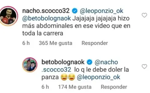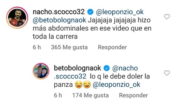 El que atacó primero fue Enrique Bologna. El ex arquero del Millo, fiel a su estilo,comentó entre carcajadas: “Estás entrenando más ahora que antes”. Al Beto se le sumó Ignacio Scocco, que no quiso ser menos y respondió a pura risa: “Hizo más abdominales en ese video que en toda la carrera”. El intercambio cerró con otra intervención del uno de Banfield: “Lo que le debe doler la panza”.