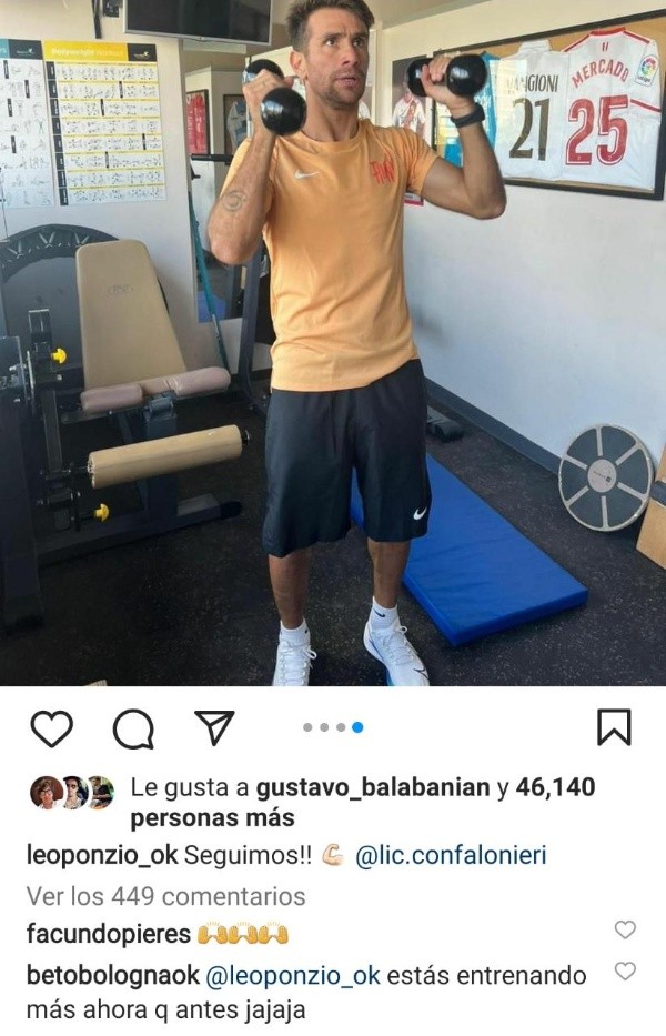 En esta oportunidad, la “víctima” de las gastadas fue nada más y nada menos que Leo Ponzio. El ex capitán millonario compartió imagenes del trabajo que viene realizando junto a Enrique Confalonieri, kinesiólogo del plantel profesional de River, para recuperarse de su lesión ligamentaria. El objetivo del León es ponerse a punto para el partido despedida, que podría realizarse antes de fin de año en el estadio Monumental. Sin embargo, no zafó de las cargadas de dos ex compañeros del plantel.