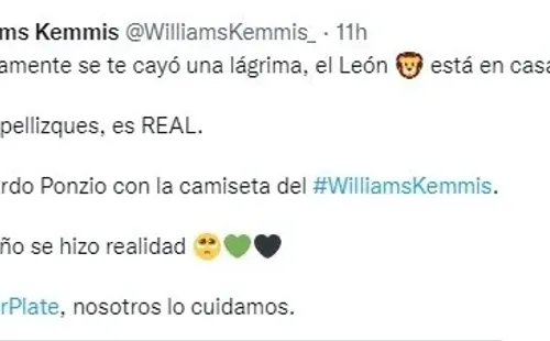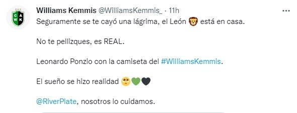 El capitán había realizado una promesa y era que iba a jugar para Williams Kemmis una vez que termine su etapa en River y como siempre lo hizo cumplió su palabra. Este viernes Kemmis visitó a Montes de Oca en un amistoso y el León fue titular. Ponzio jugó con la camiseta número 5 –ya que la numeración es del 1 al 11, sino hubiese jugado con la 23- y su equipo, del cual es vicepresidente, ganó por 2 a 1. Kemmis se prepara para el comienzo de la Liga Cañadense que será el domingo 13 de febrero ante Correa en condición de local, luego enfrentará a Campaña, Argentino, Tortugas, Barraca y en la fecha 6 será el clásico ante Almafuerte. Por su parte desde la cuenta oficial de Twitter Williams Kemmis le dejó un mensaje a River: “Seguramente se te cayó una lágrima, el León está en casa. No te pellizques, es real. Leonardo Ponzio con la camiseta de Williams Kemmis, el sueño se hizo realidad. River Plate, nosotros lo cuidamos”.