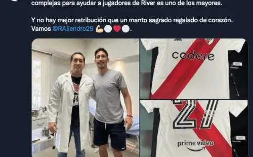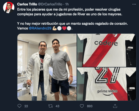 A su vez, el volante tuvo la gentileza de regalarle una camiseta suya con el número 27 al especialista en señal de agradecimiento por haberlo atendido después de la dura lesión que sufrió. El Peti será el primer refuerzo de Gallardo para el 2023 y la gente está con ansias de poder verlo triunfar con el Manto Sagrado después de los dos cachetazos que tuvo este semestre (la fractura con Boca y también el codazo que recibiócon Vélez en la Libertadores).