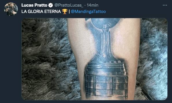 El Oso se desvinculó hace algunas semanas de River y está terminando de ponerse a punto físicamente para debutar en Vélez, pero mientras tanto aprovechó para inmortalizar la final de Madrid. ¿Con un cuadro? ¿Una camiseta? No, con un espectacular tatuaje en su pierna izquierda. El artista Gustavo Nicolás Salvo dio a conocer el diseño que el delantero ya tiene tatuado: el trofeo de la Libertadores con lujo de detalle y debajo la fecha histórica de la final en Madrid con una letra estilo cursiva.