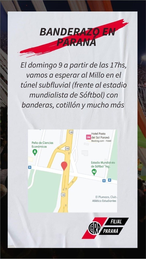 Como en esta oportunidad el cuerpo técnico del Más Grande decidió pasar la noche del sábado en Santa Fe y llegar a Paraná unas horas antes del partido, los hinchas de River preparan un banderazo especial. ¿Cuándo y dónde se realizará? Este domingo, a partir de las 17 horas, en la salida del túnel subfluvial, frente al estadio mundialista del sóftbol.
