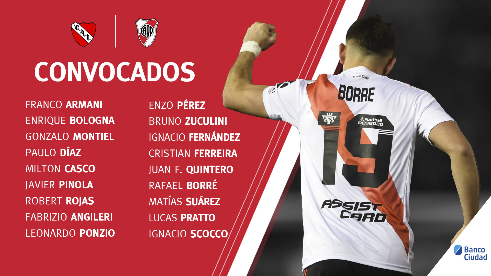 Para dicho encuentro ante el Rojo, Marcelo Gallardo dio a conocer esta tarde la nómina de 18 futbolistas que quedarán concentrados en el estadio Monumental este sábado por la tarde, luego del entrenamiento que se realizará allí mismo. ¿Quiénes son las ausencias destacadas de la lista? Lucas Martínez Quarta, Nicolás De La Cruz, Julián Álvarez y Jorge Carrascal.