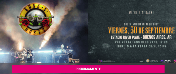 La producción del evento adelantó que los Guns realizarán una gira mundial con tres de sus integrantes originales: Axl Rose, Slash y Duff McKagan. La preventa de entradas para sus shows en el Monumental comenzará este jueves 24 de marzodesde las 12 horas (exclusiva para su fans club) a través de la plataforma All Access, mientras que la venta para el público en general será el viernes 25/3, a partir del mismo horario.