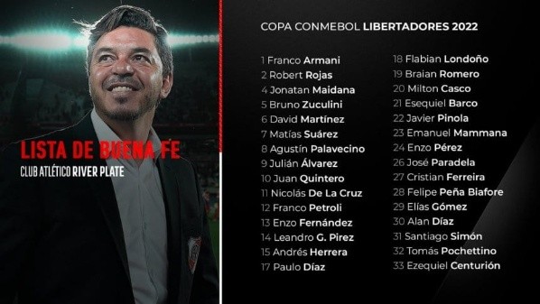 ¿Cuál será la fecha límite para presentarla? Todavía hay tiempo hasta el próximo 25 de junio hasta las 18 para dar a conocer la nómina definitiva, donde el Muñeco se tomará las próximas semanas para tratar de cerrar junto a la dirigencia alguna incorporación, sabiendo que todavía contará con Julián Álvarez, quien se irá rumbo a Inglaterra luego del partido de vuelta frente a Vélez. Hasta el momento el que cuenta con mayores posibilidades de ser uno de los cambios de la lista es Lucas Beltrán, con quien en estas horas se está negociando con Colón para determinar si esta misma semana podrá comenzar los entrenamientos con la banda roja mediante la finalización anticipada de su préstamo con el equipo santafesino.