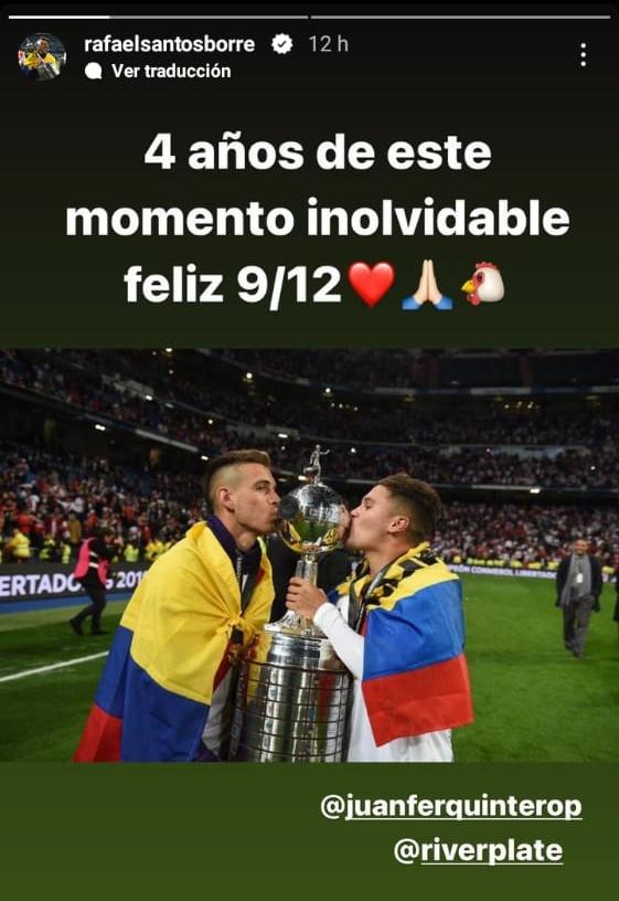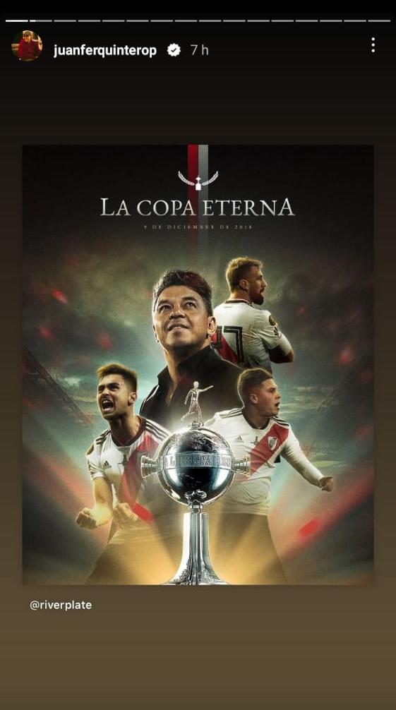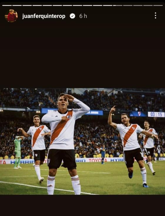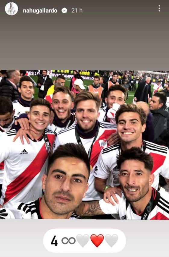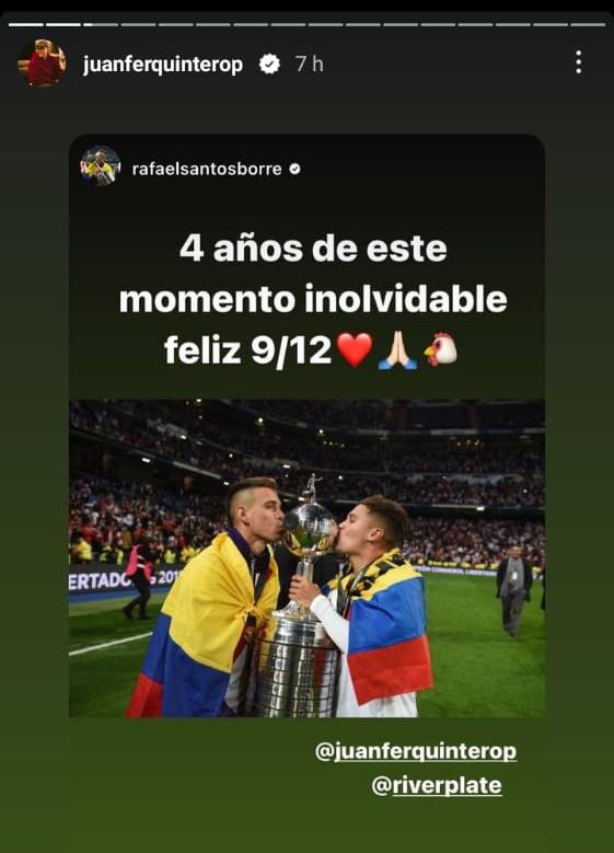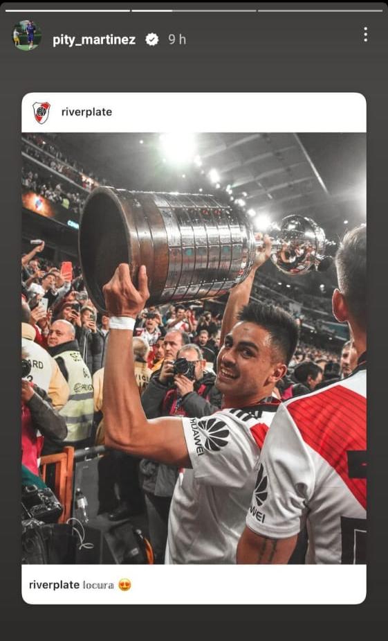 El Pity Martínez y Juanfer Quintero fueron los más activos a la hora de postear historias y replicar publicaciones en sus cuentas de Instagram. Rodrigo Mora, Nahuel Gallardo y Rafale Borré, tres que no sumaron minutos, también lo vivieron de una forma especial. Fuera de la cancha, una dupla de ex River mostró la felicidad que vivieron desde la tribuna: Fernando Cavenaghi y Leandro Chichizola subieron un video del grito de gol en el tanto del Pity. Son sólo algunos ejemplos del recuerdo vivo una final inolvidable e irrepetible.