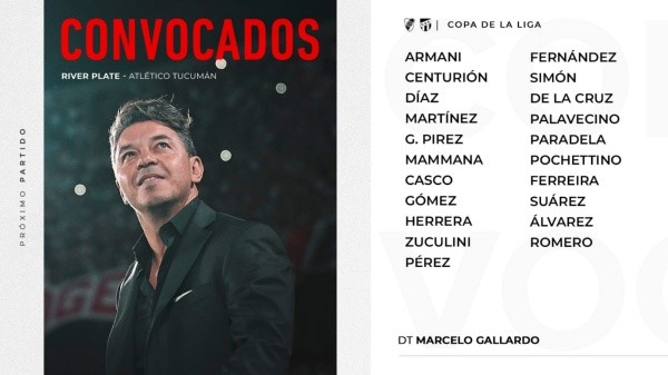 En principio, Gallardo no volverá a rotar y pondrá en cancha a sus mejores futbolistas, tanto contra Atlético Tucumán como ante Colo Colo:Franco Armani; Andrés Herrera, Paulo Díaz, David Martínez, Milton Casco; Enzo Pérez, Enzo Fernández, Agustín Palavecino o Santiago Simón, Nicolás De La Cruz; Matías Suárez y Julián Álvarez.