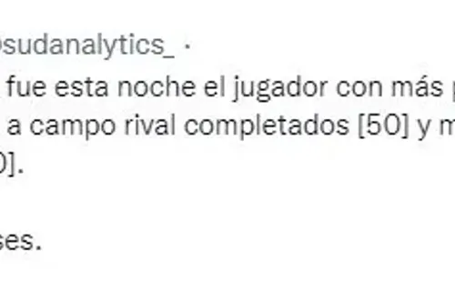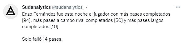 El Muñeco fue mutando el 11 inicial con el correr de los partidos y poco tiene que ver el equipo que salió a la cancha en los últimos partidos con los que comenzaron el semestre, es que algunas lesiones hicieron que el DT tenga que utilizar a casi todo el plantel y con Gallardo el que está bien juega como titular y así se fue ganando un lugar Enzo Fernández. La cuenta de Twitter @sudanalytics_ se encarga de recopilar datos y en el duelo entre River y Patronato contabilizó la precisión de Enzo Fernández en sus pases: completó 90, de los cuales50 fueron en campo rival, 10 fueron largos y solamente falló 14 pases.