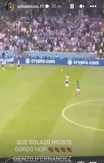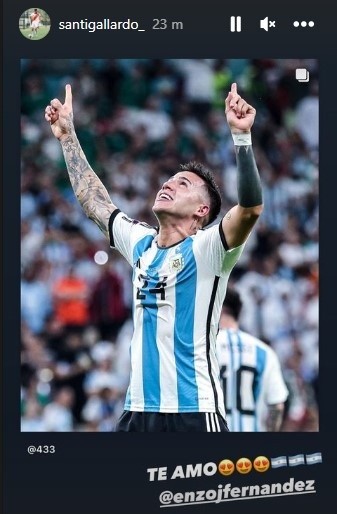 Las reacciones al gol de Enzo Fernández fueron de las más diversas. Los hijos de Marcelo Gallardo subieron en sus cuentas de Instagram algunas historias para resaltar la obra de arte que construyó el mediocampista en ese 2-0 frente a México. “Te amo gordo hdp” y “Orgullo puro” fueron las palabras que eligió Nahuel para felicitar a Enzo. “Qué locura”, posteó Matías. Y Santino no quiso quedarse afuera y publicó: “Te amo Enzo Fernández!”.