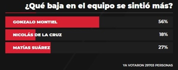 En La Página Millonaria le preguntamos a los hinchas qué baja se sintió más en el equipo en este semestre, las opciones para votar en la encuesta son Gonzalo Montiel, Nicolás De La Cruz y Matías Suárez. Cachete ya no está en el equipo y tanto el uruguayo como el cordobés se encuentran lesionados. Los resultados fueron concluyentes: hubo casi 30 mil votos y el 56% consideró que la ausencia que más se nota es la de Gonzalo Montiel, en segundo lugar aparece Matías Suárez con un 27% y finalmente Nicolás De La Cruz con un 18%.